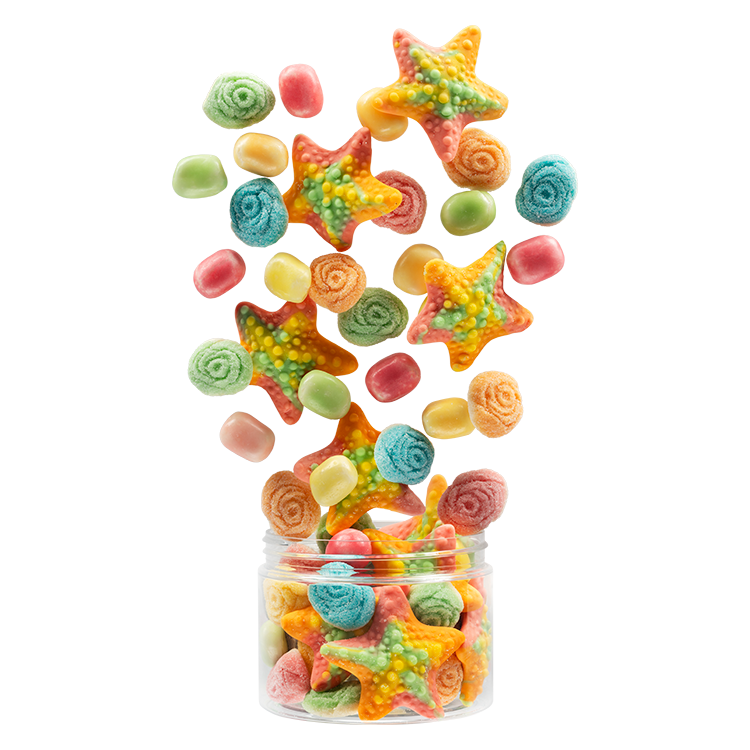 Zestaw EGZOTYCZNY to kompozycja żelków i gum rozpuszczalnych o charakterystycznym smaku i aromacie owoców egzotycznych.