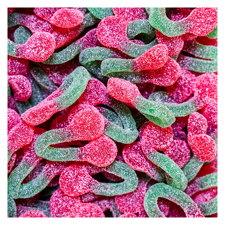 Żelki w kształcie oraz smaku wiśni, w posypce cukrowo-kwaskowej, w rozmiarze XXL.